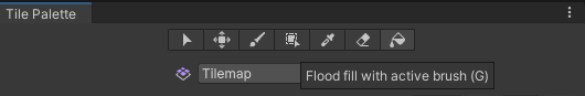 Paint on the active Tilemap with the painting tools from the Tile Palette toolbar at the top of the Tile Palette window (highlighted below). These tools can also be used to edit and paint on the Tile Palette itself.