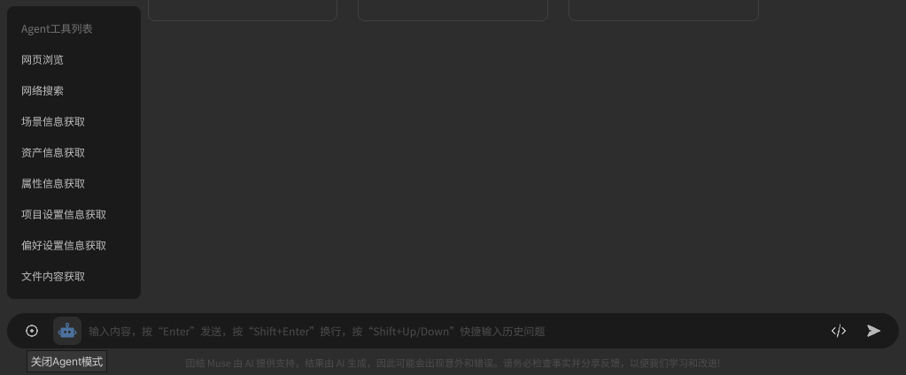 团结Muse Chat默认启用Agent模式进行回答。Agent模式下团结Muse Chat会自主调用网页搜索能力,并会分析项目信息以增强回答质量。Agent模式下所有获取的信息仅用于辅助当前问题的回答,不会参与数据训练等其他用途。用户可以自行选择是否启用: