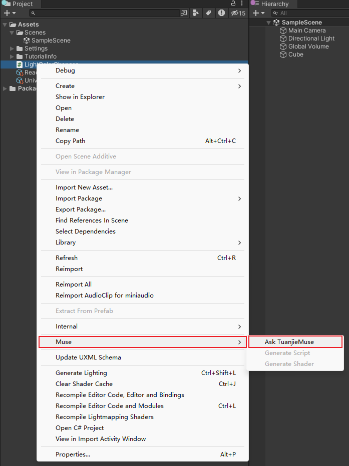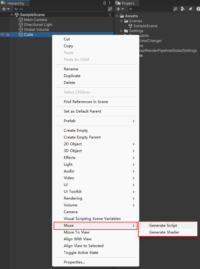 在Hierarchy或者Project面板中,右键GameObject或Asset,在菜单项中可以选择 Muse > Generate Script 或者 Muse > Generate Shader: