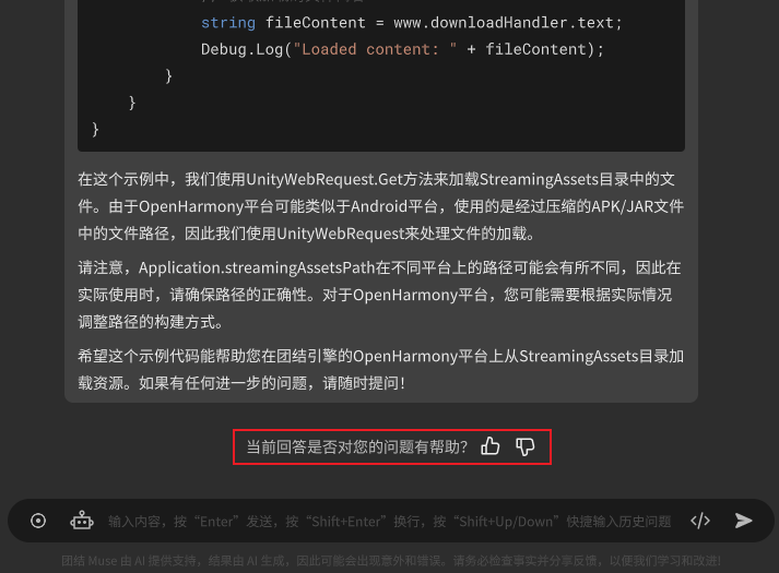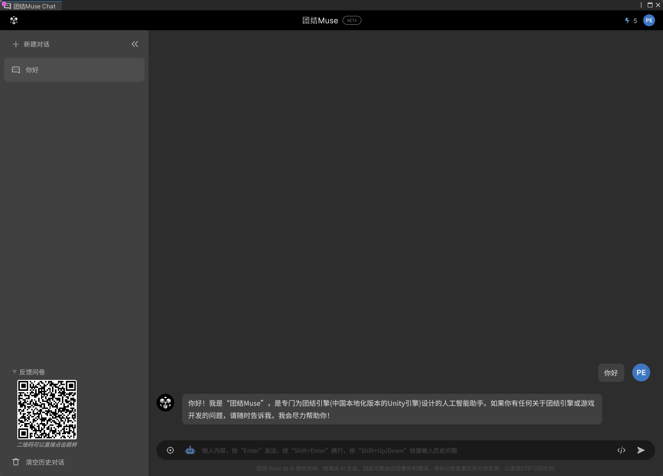 团结 Muse 是 Unity 中国推出的首个适配团结引擎的人工智能助手产品,专为中国本土开发者而定制,它可以理解并回答涉及团结引擎使用、脚本编写、资源管理等多方面的各种问题,加速您的实时 3D 应用创作流程。团结 Muse Chat 是其首个开放内测的功能,无论您在编写代码、设计游戏场景,还是在优化性能时遇到问题,只需向团结 Muse Chat 提问,它就能为您提供及时、精准的解答。