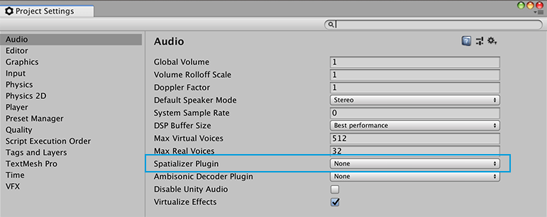 After you have added the package containing an audio spatializer plug-in to your project, you can enable the plug-in in the project audio settings.