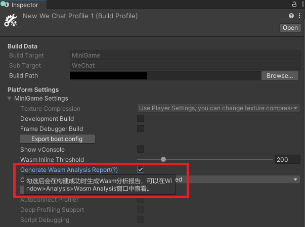 您可以配置并勾选小游戏构建配置文件 Inspector 中的 “Generate Wasm Analysis Report(?)” 选项。之后在构建项目成功后会自动弹出 Wasm Analysis 窗口。