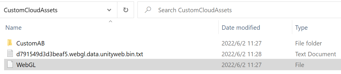 注意:由于 AssetBundleManifest 对应的 AB(下图WebGL文件)文件名不带 hash,不能放入微信缓存目录(CustomCloudAssets/CustomAB)中。否则后续游戏版本更新后,AssetBundleManifest 可能始终从缓存中获取,导致 AB 无法更新。