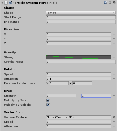 | Attraction | Set the strength at which Unity drags particles into the vector field motion. The higher the value, the greater the attraction. You can specify a constant attraction or vary the attraction over time. See Varying properties over time. | |