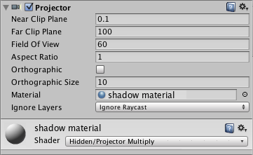 A Projector works by projecting a material onto all objects that intersect its frustum. The material must use the Projector/Light or Projector/Multiply shaders, available in Unity’s Standard Assets.