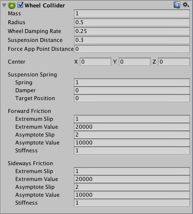 | Forward/Sideways Friction | 车轮向前和侧向滚动时轮胎摩擦的特性。请参阅下面的_车轮摩擦曲线_部分。 |