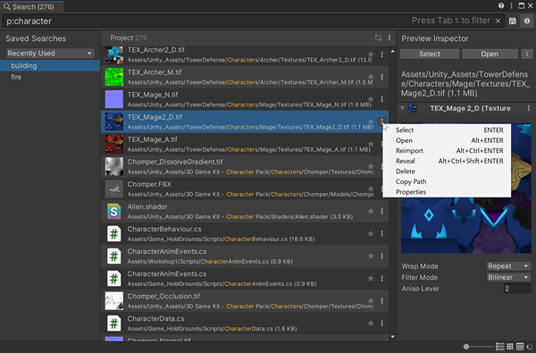 Search uses its own Asset indexer, which is faster and more flexible than the Asset Database or the Project Browser.