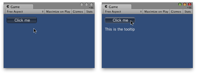 public class ExampleClass : MonoBehaviour { void OnGUI() { // Make a button using a custom GUIContent parameter to pass in the tooltip. GUI.Button(new Rect(10, 10, 100, 20), new GUIContent("Click me", "This is the tooltip"));
