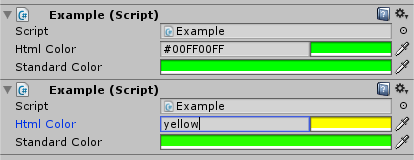 public class Example : MonoBehaviour { [ColorHtmlProperty] public Color htmlColor = Color.green;
