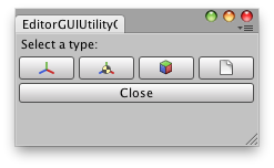 void OnGUI() { EditorGUILayout.PrefixLabel("Select a type:"); EditorGUILayout.BeginHorizontal(); if (GUILayout.Button(EditorGUIUtility.ObjectContent(null, typeof(Transform)).image)) DoSomething("Transform"); if (GUILayout.Button(EditorGUIUtility.ObjectContent(null, typeof(Rigidbody)).image)) DoSomething("RigidBody"); if (GUILayout.Button(EditorGUIUtility.ObjectContent(null, typeof(GameObject)).image)) DoSomething("GameObject"); EditorGUILayout.EndHorizontal();