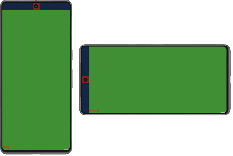 The following image depicts how the safe area and cutouts appear on Google Pixel 7 Pro (API 35) in portrait and landscape modes. The green area is the safe area, while the red area is a cutout.
