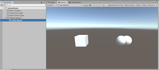 The new parent cube is on the left of the screen and the child sphere is in its original position, next to the parent sphere on the right of the screen.