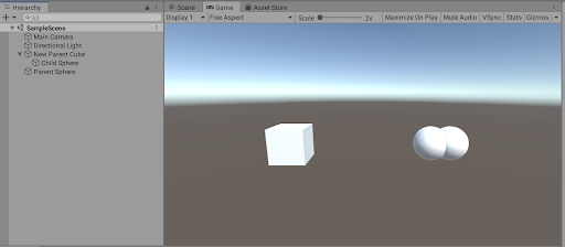 The following images are of a scene with three GameObjects: a new parent cube, a parent sphere, and a child sphere.