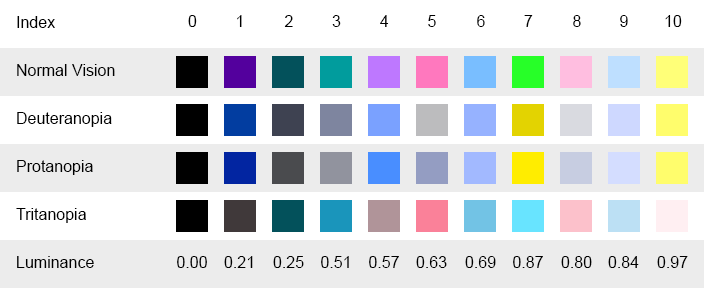 // request new palette private void UpdatePalette() { m_Palette = new Color[m_PaletteSize]; m_NumUniqueColors = VisionUtility.GetColorBlindSafePalette(m_Palette, m_DesiredLuminance.x, m_DesiredLuminance.y); } }