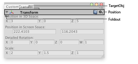 showing = EditorGUI.InspectorTitlebar(new Rect(0, 0, position.width, 20), showing, currObj, showing); if (showing) { if (currObj) { currObj.position = EditorGUI.Vector3Field(new Rect(3, 15, position.width - 6, 20), "Position in 3D Space:", currObj.position);