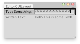 void OnGUI() { text = EditorGUILayout.PasswordField("Type Something:", text); EditorGUILayout.LabelField("Written Text:", text); } }